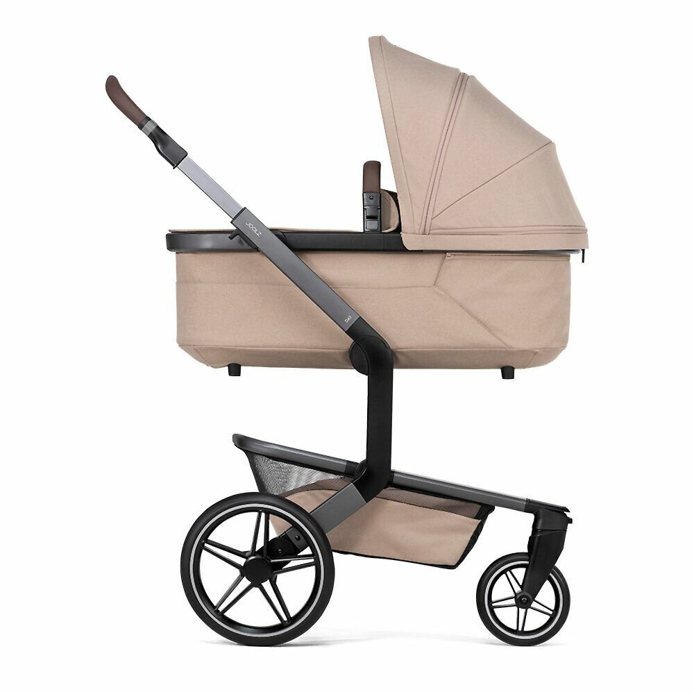 JOOLZ DAY5 Sandy Taupe — универсальная коляска, сочетающая стиль и функциональность. Серое шасси с регулируемой ручкой подойдет родителям разного роста. Более того, съемные колеса диаметром 30 см обеспечивают плавный ход даже на неровных дорогах.